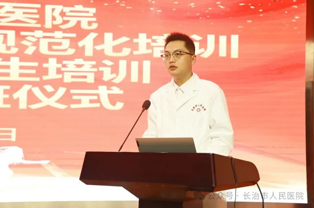 2025级住培医师代表陕一菲同学,以院训“求真、存仁、尚新、致和”为指引,满怀激情地表达了对即将开始的住培生活的憧憬与努力学习的决心。他表示全体住培医师将积极适应新环境,以饱满的热情和昂扬的斗志投入到未来的学习和工作中。