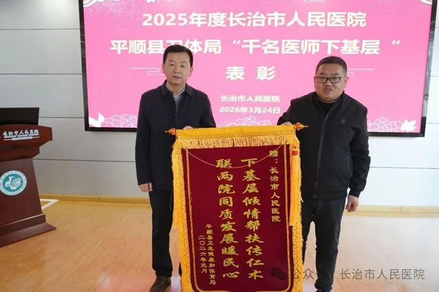 3月24日,平顺县卫生健康和体育局局长张小鹏、平顺县人民医院院长马勇刚一行来到长治市人民医院,向在 “千名医师下基层” 工作中给予的精准帮扶表示诚挚感谢,并为我院在 2025 年该工作中表现突出的优秀队长、队员颁发荣誉证书。长治市人民医院党委书记胡文庆、院长王晚萍、医务科主任李勇爱、受表彰人员及相关科室主任参加活动。